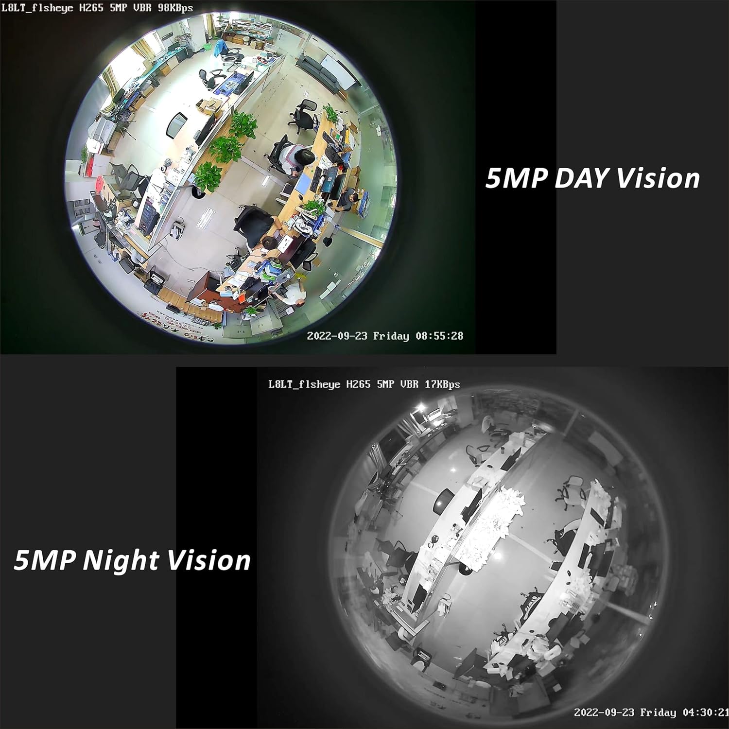 - H.265 Super HD 5MP The 5 Megapixel (2592 x 1944) Super-high-definition security panorama camera provides you a wide viewing angle high resolution image.
